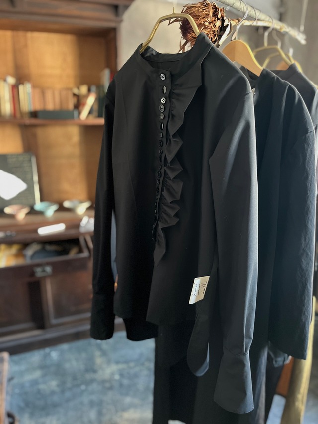 胸もとにフリルをあしらった かぶって着るタイプのブラウスです。 フリルの甘さを少しライトにするため、 襟はバンドカラーでユニセックスな雰囲気に。 素材も薄手ながらハリがあるため、 縦のラインが生まれやすくなっており、 横方向へ流れるフリルのシルエットを さりげなく引き立てています。 カフスは花のカラーをイメージしていて、 手の甲まですっぽり隠れる長さに。 指先だけさりげなく見えることで、 より女性らしさが引き立ちます。 カフスは二重に折り上げて 手首のあたりでまとめていただくこともできます。 胸にはサイズ違いの黒ボタンを いっぱいつけました。 スカートやスラックスなど きれいめのコーディネートはもとより、 デニムなどでサクッと軽く着ていただいても、 雰囲気が楽しめるかと思います。 サイズM 肩幅約39cm 身幅約48cm 前丈約58cm 後ろ丈約69cm 袖丈約63 サイズ L 肩幅約42cm 身幅約53cm 前丈約64cm 後ろ丈約75cm 袖丈約63cm ※採寸には若干の誤差がありますが。 ※ボタンは都度変更になる場合があります。 黒の素材はポリエステル65%、綿35% ピンストライプの素材は綿100%